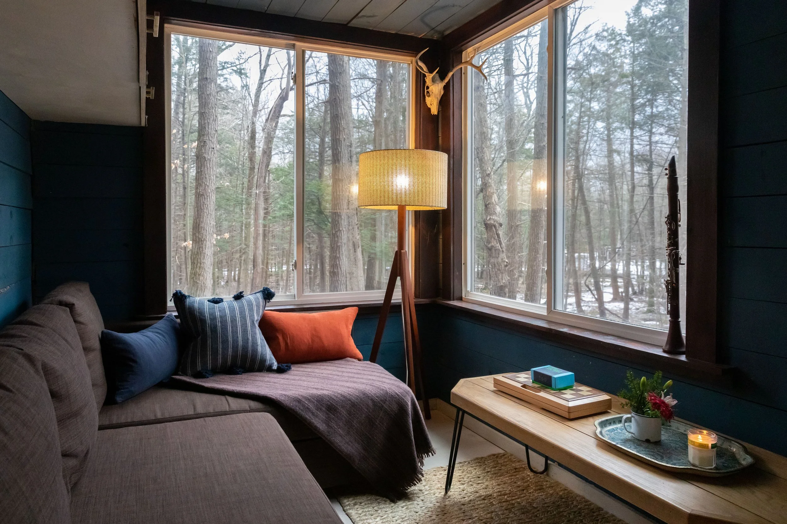 The off-grid setup of the cabins brings you even closer to nature—while still providing the comforts of home. You use filtered water from our land, electricity from the sun, and heat from woodcut in the forest. There are traditional comforts of home as well: propane cooktop, kitchen tools, BBQ grill, and heaters. The beds in the 20-footers are queen-size sofa beds, with Evergreen Stitches organic percale linens. (The 40-footer has a traditional bed in addition to a sofa bed.) The kitchen sink uses a foot pump to do dishes. A classic, steel-banded Coleman cooler keeps your perishables fresh. (The 40-footer has a refrigerator.) The outdoor shower and tub have hot and cold water (tub stargazing is a wonder to behold), and the toilet is a compost toilet set in a small outbuilding twenty feet away.