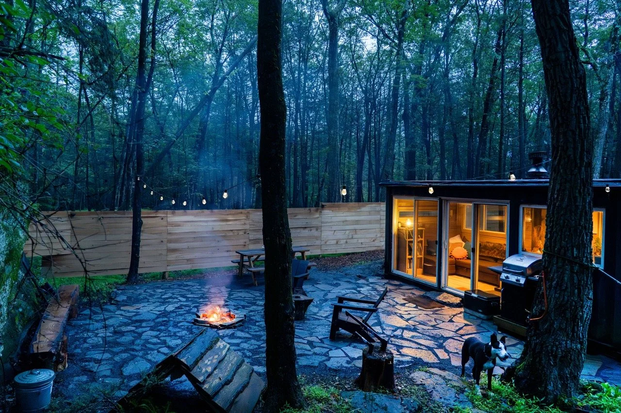 Each cabin has a deck with patio chairs and a separate slate patio with a fire pit and Adirondack chairs. There is a yoga platform at each and dedicated driveways for each cabin with parking spots ten feet away. Walking trails around the property meander along streams, waterfalls, mediation centers, Finnish sauna, and a wood-fired hot-tub. Endless hiking, recreation and restaurants can be found 15 minutes away in Catskills Park, Woodstock, Kingston, Catskill and Saugerties.