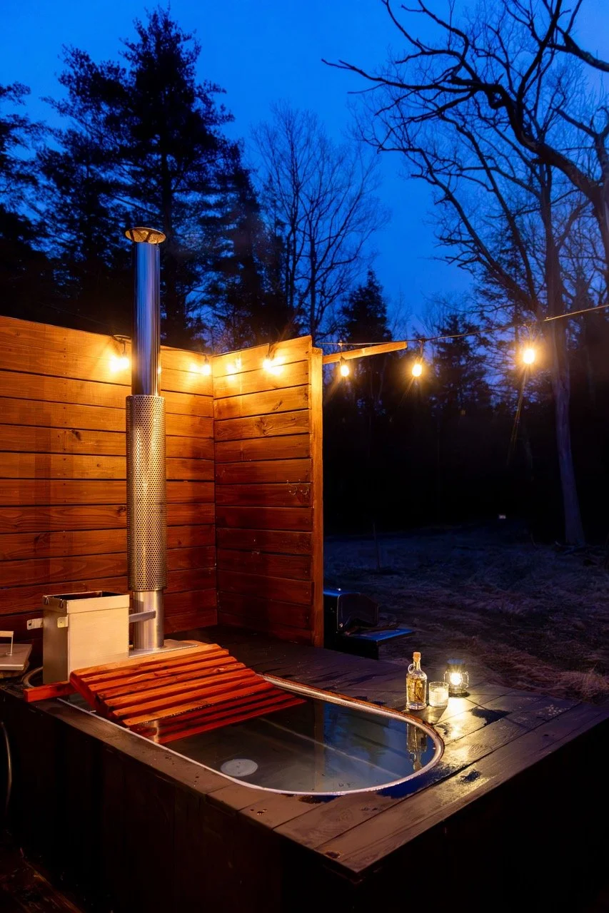 Follow the hot tub path to a two-person wood-fired hot tub set on the edge of the stream. Build a fire in the submersible stove then soak under a canopy of old-growth hardwood trees and watch wildlife move through the forest. The sound of the stream and wind through the trees will carry you to another place.