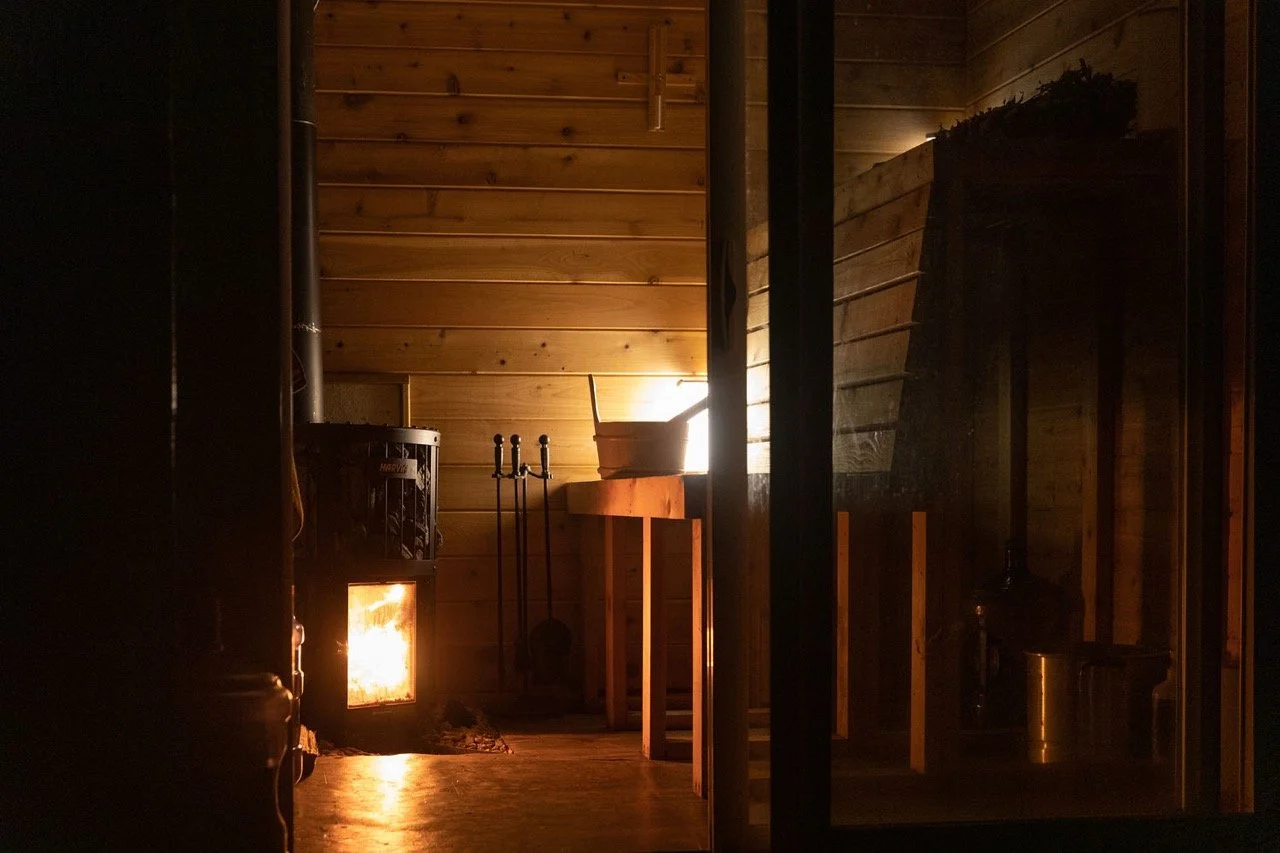 Follow a short trail from the driveway to a traditional Finnish wet sauna set in the woods inside a 10-foot shipping container. Two tiers of cedar slat benches offer varying levels of heat and steam. Toss water on the Finnish Harvey Legend sauna stove for a quick burst of heat or bath in the shower stall in the corner. A hundred yards down the hill as a small wading pool in the stream, perfect for a cold plunge in all seasons.
